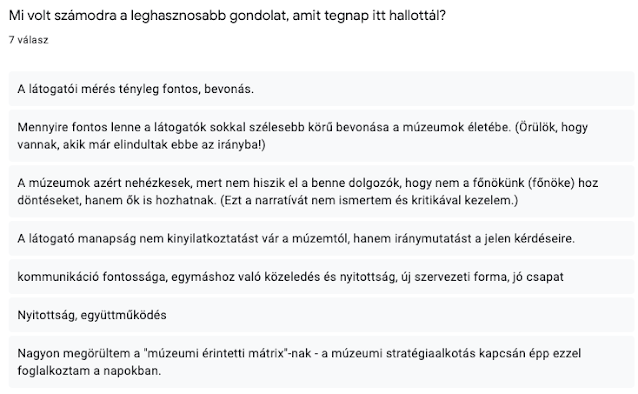 - „Mennyiben látják lehetőségét annak, hogy a múzeumi kollektívákon belül a merev, hagyományos, tekintély alapú struktúrák hierarchikus működési rendje oldódjon ..? Várható-e az „emberségesebb” működés a továbbiakban a kollégák között – és a látogatók igényeinek figyelembe vételében?”
